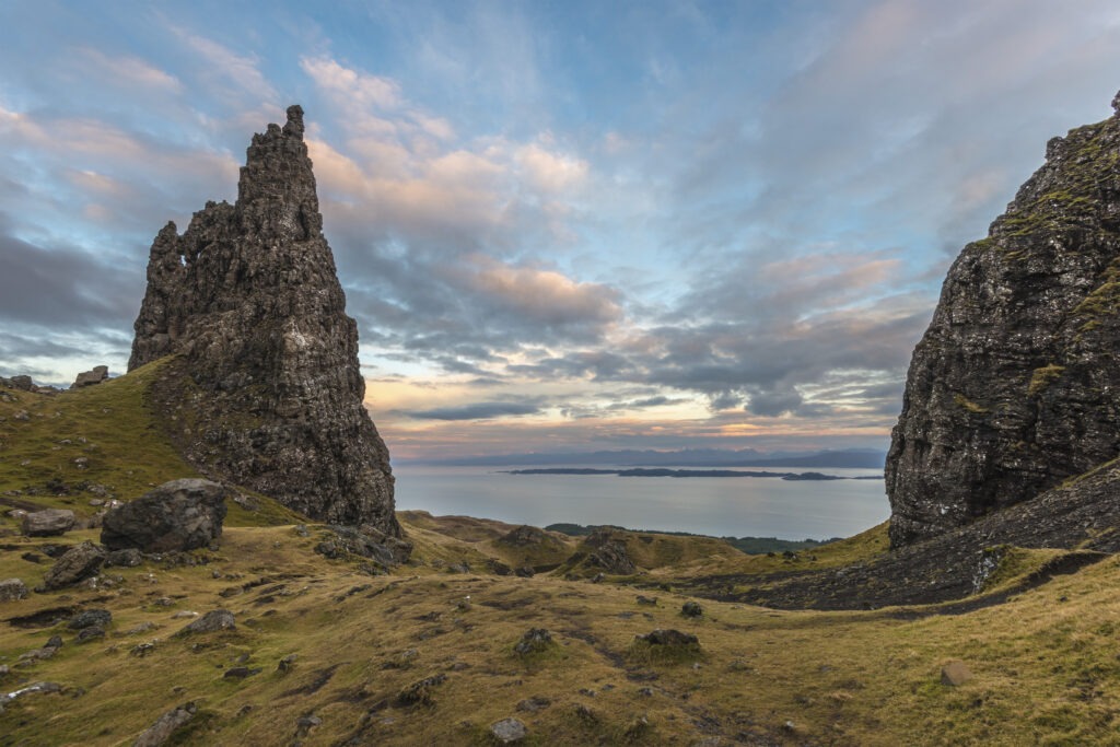 The Isle of Skye is one of the most inspirational places in the UK for landscape photography. This is a view from the Old Man of Storr back towards the Scottish mainland. A few snow-peaked mountains can be seen in the distance.