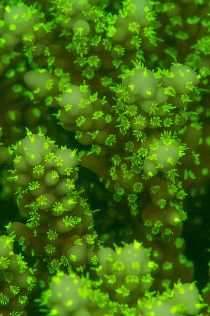 Corals of the Pocillopora genus are some of the fastest growing on the coral reef, and are therefore an important part of the reef building process. They tend to be found in shallow water – this one was at about 5m on the reef edge. The fluorescent coral polyps contain zooxanthellae – symbiotic algae which provide the energy for growth through photosynthesis.