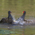 Moorhen fights These two moorhens Gallinula chloropus are fighting over a mate, but it is more likely to be two females fighting over a male than the other way round. The male is more likely to be seen passively sitting on the nest. This behaviour typically occurs around April at the start of the breeding… Read more: Moorhens fighting – all is not as it seems.