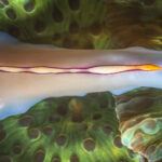 Racing stripe flatworm swims over Discosoma coral Location & date Chocolate Island, Malapascua, Philippines. 16th November 2014 Subject The racing stripe flatworm Pseudoceros bifurcus is a ‘say what you see’ species. The distinctive white stripe with dark border easily identifies this species. This example has a cut, possibly a bite mark, on one side. This particular… Read more: Racing stripe flatworm