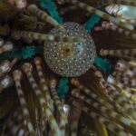 The Echinothrix calamaris, a sea urchin known for its distinctive banded spines and blue star pattern on its test, is common in the Philippines. A photographer, while generally avoiding them, captured a close-up of its unique features in Malapascua on November 14, 2014, despite their reclusive, nocturnal nature.