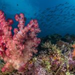 On November 19, 2014, a vibrant scene of soft coral, Dendronephthya sp., with a fish shoal was captured in Calanggaman Island, near Malapascua, Philippines. Notably, this area benefits from Marine Protected Areas, leading to thriving fish populations. The image was taken with a Nikon D800, using a 15mm Sigma fisheye lens.